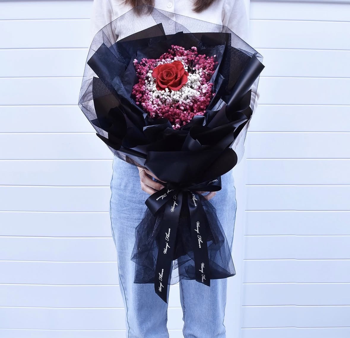 以細緻網紗包覆,呈現優雅浪漫的層次感,搭配精選永生玫瑰,送禮體面、高級、有溫度。