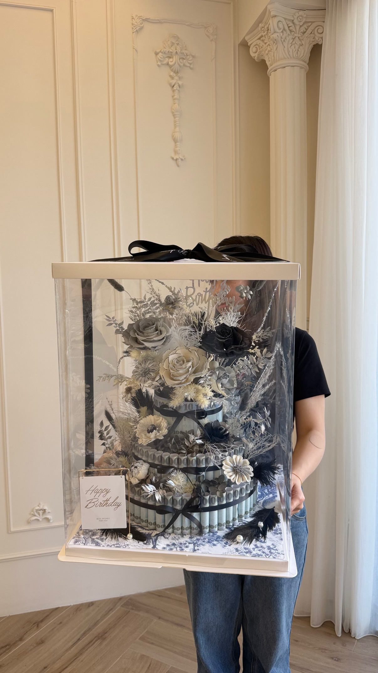 以奢華系永生花搭配客製化鈔票設計,打造專屬儀式感的驚喜禮物。