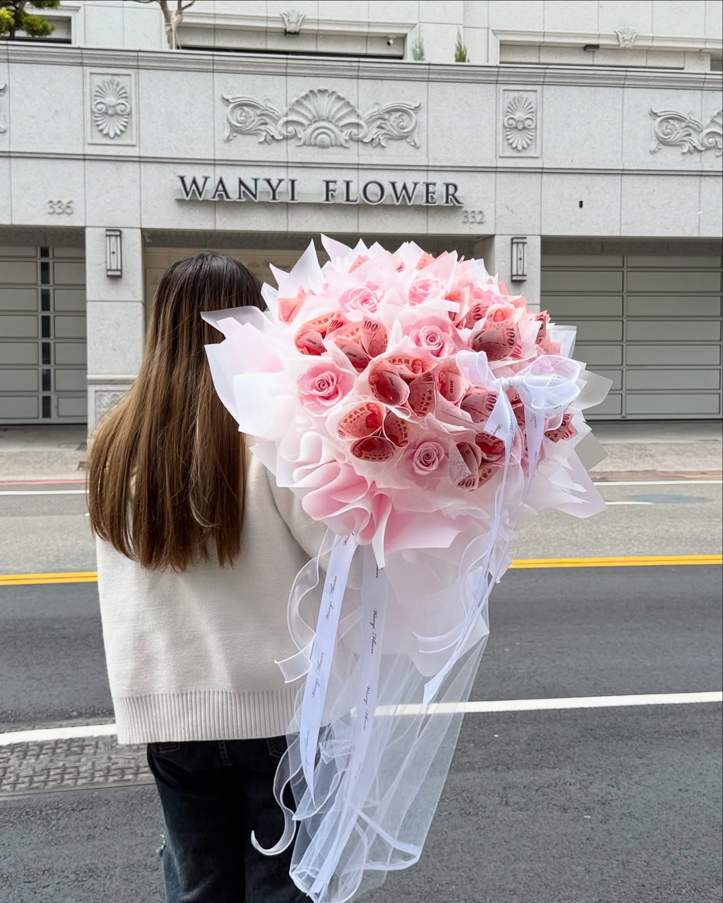 以精緻多層次包裝手法打造的華麗鈔票花束,