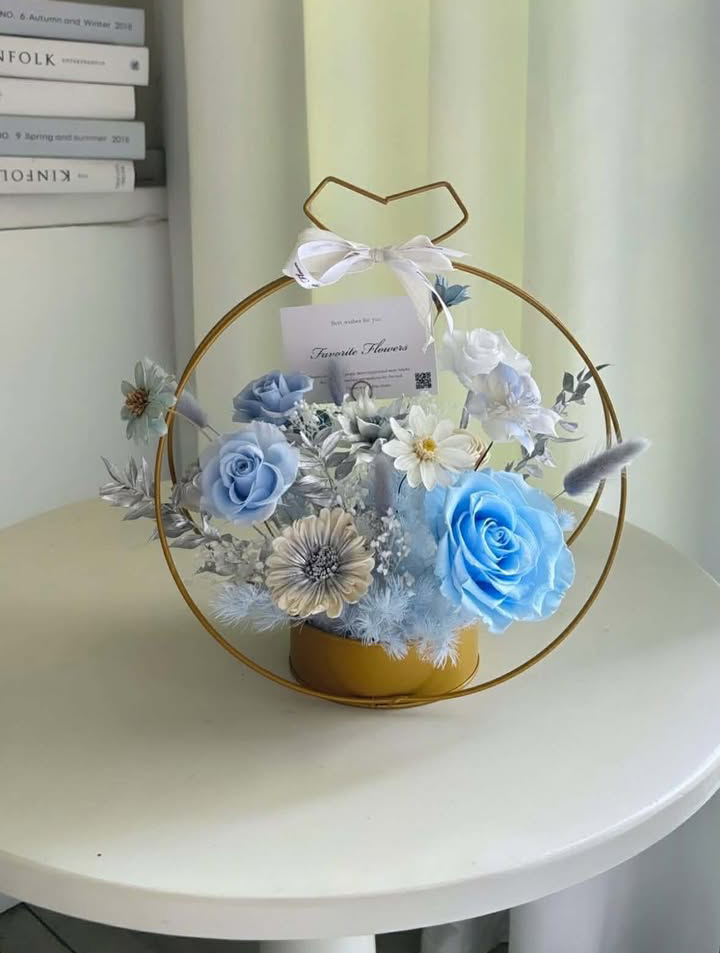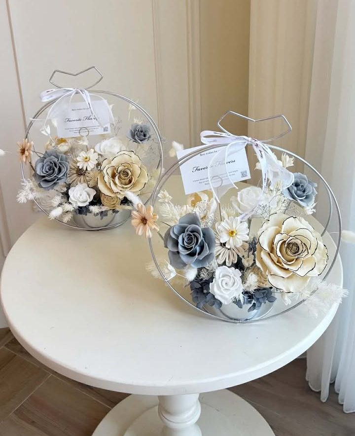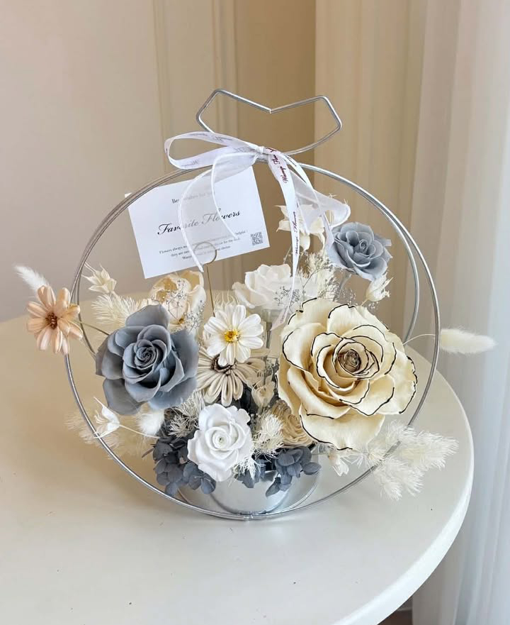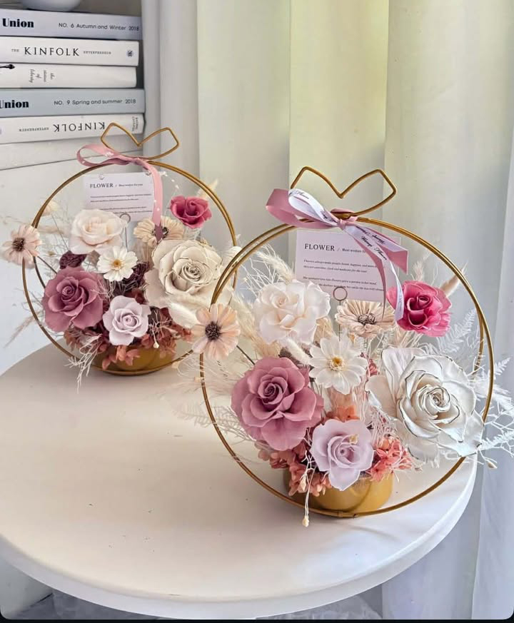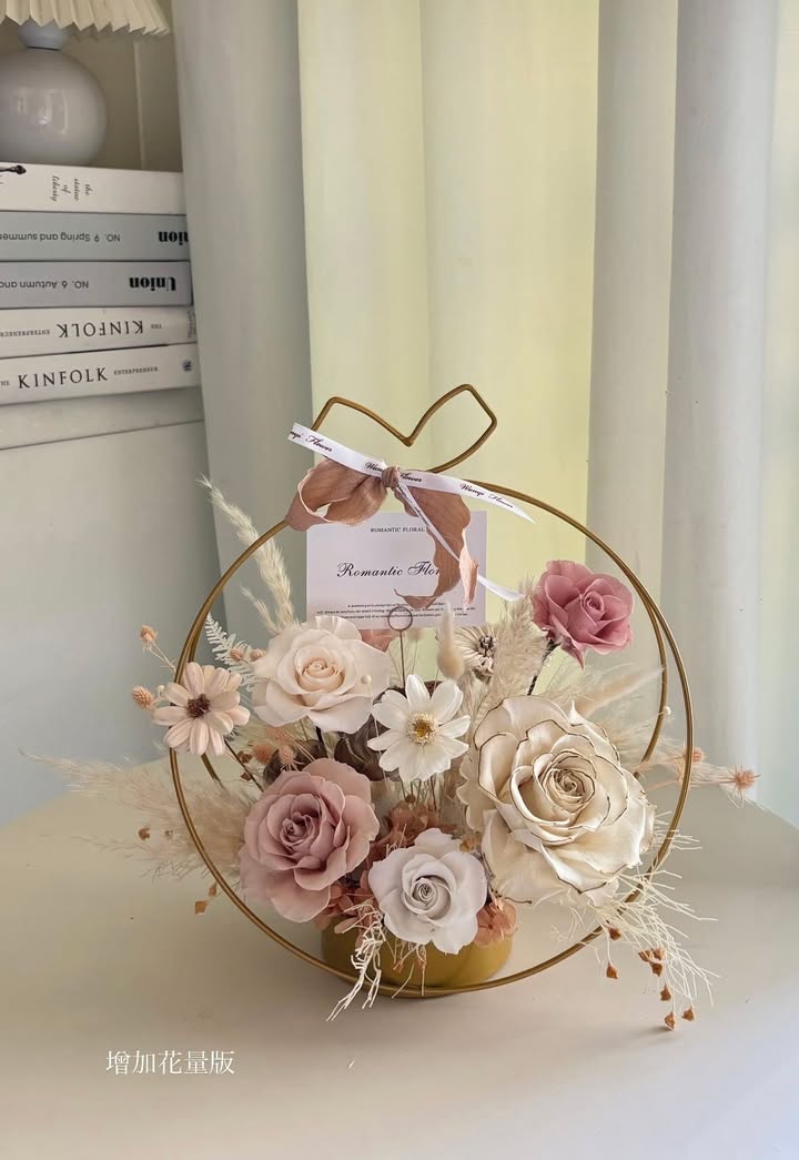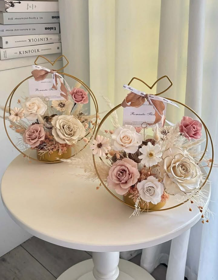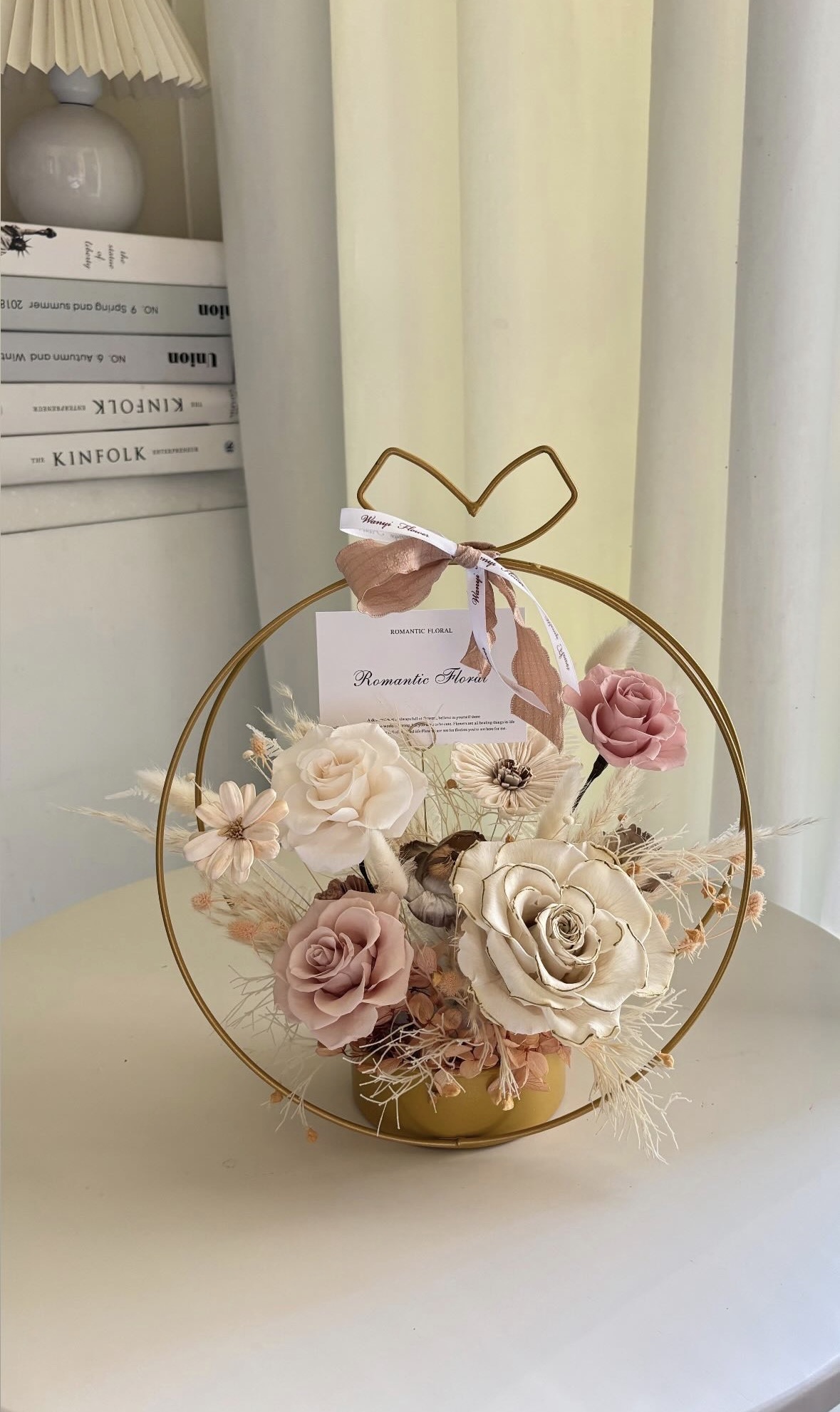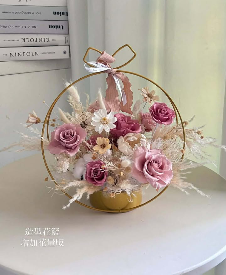 以法式圓形金屬花框打造的輕奢永生花禮,呈現柔美又高級的空間氛圍。