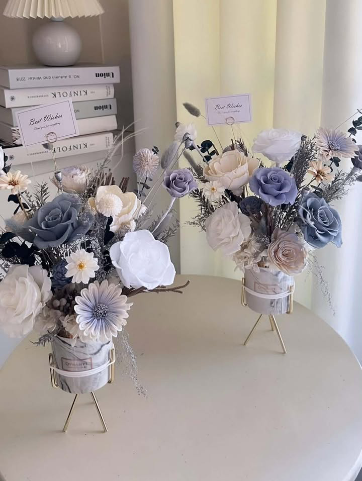以永生花為主花材,搭配細緻乾燥花、進口葉材與客製色系設計,