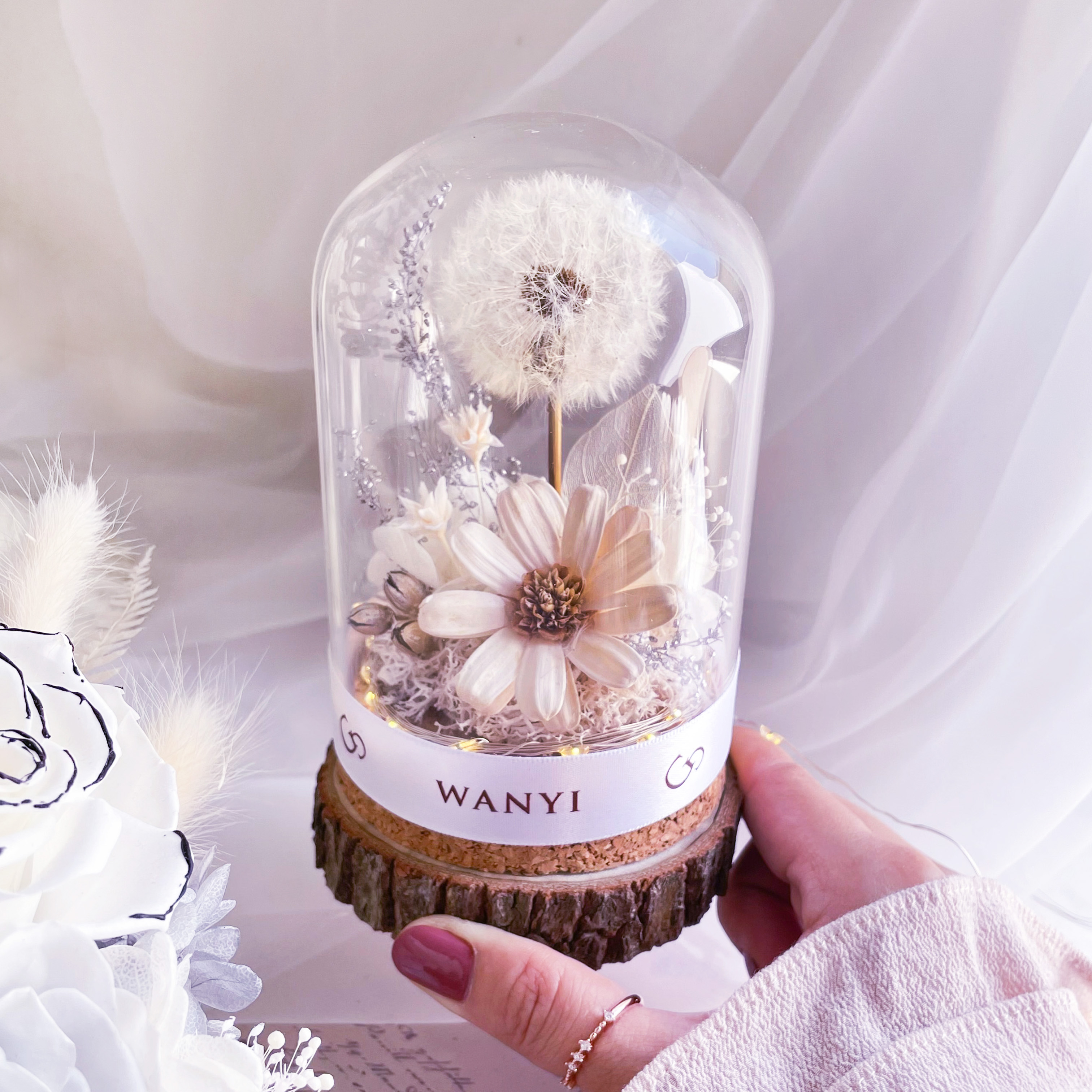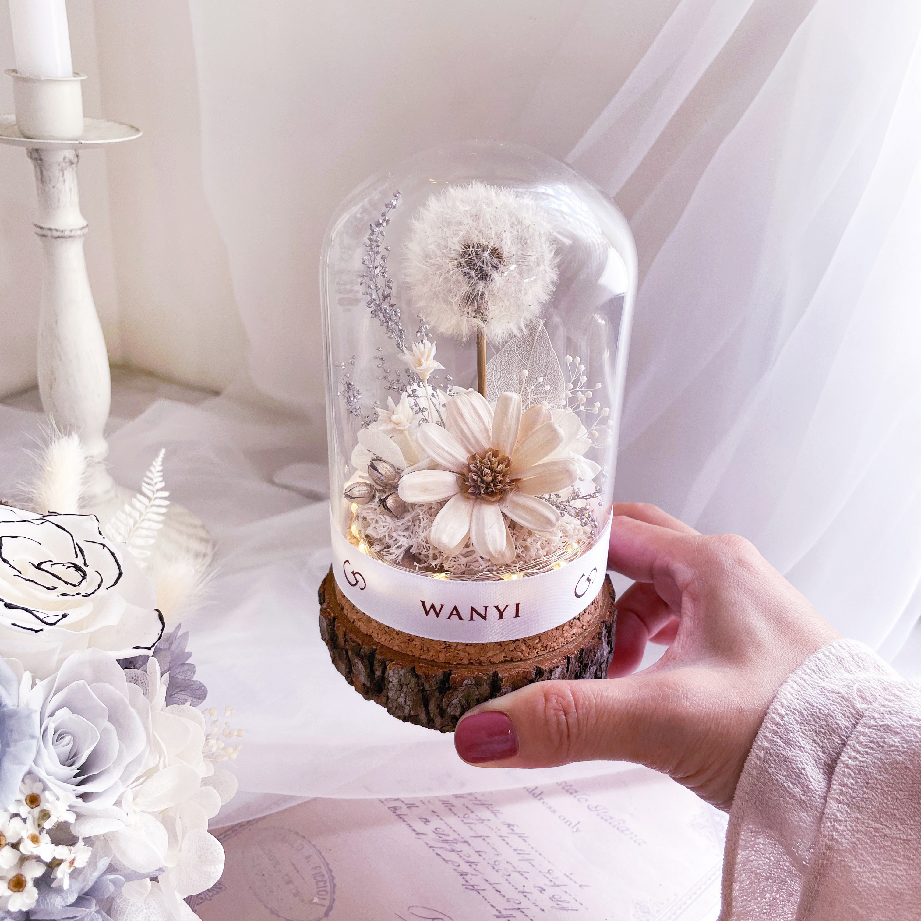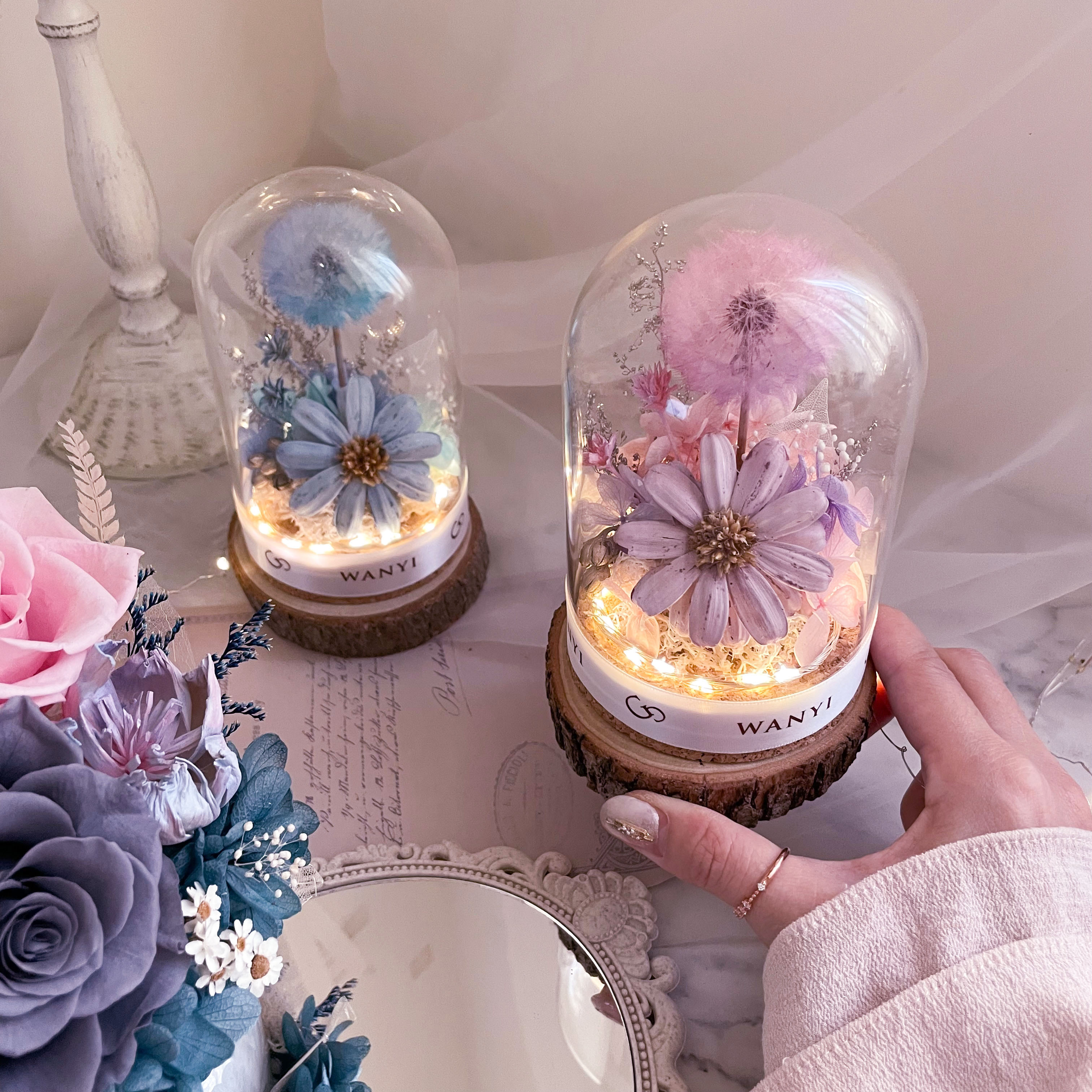 材質:玻璃罩、永生花、蒲公英、原木底座