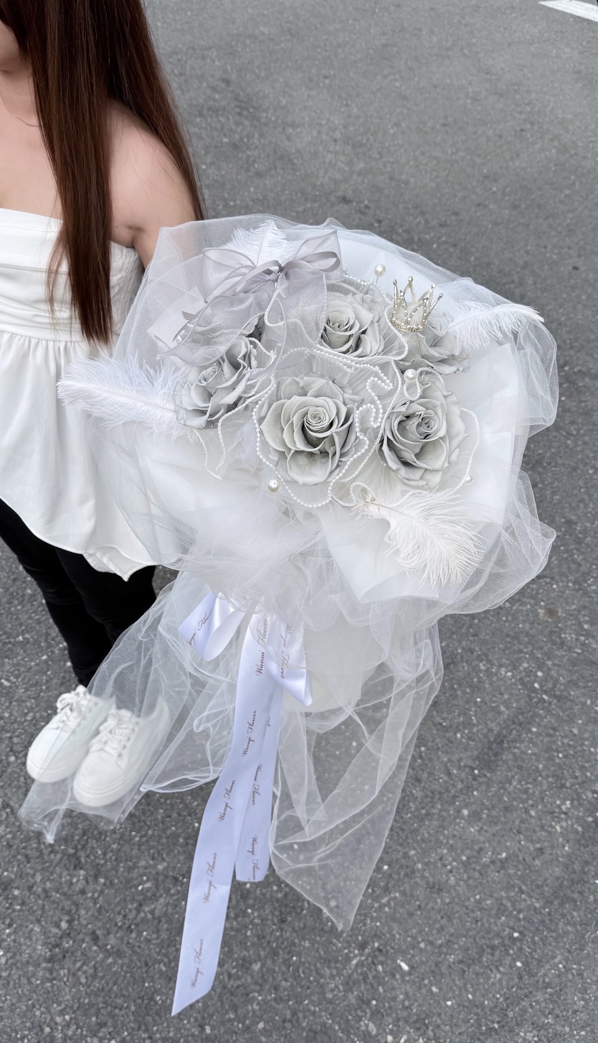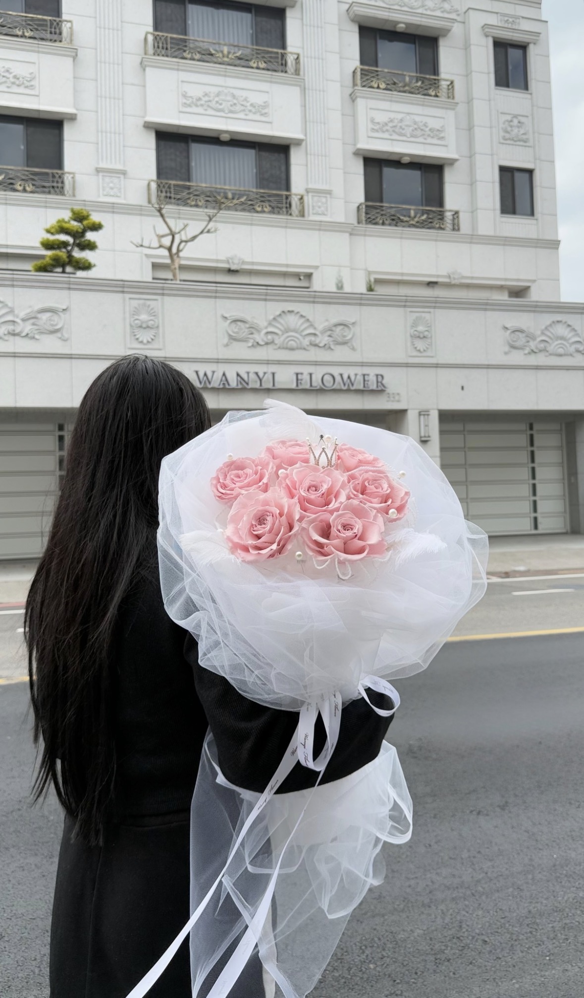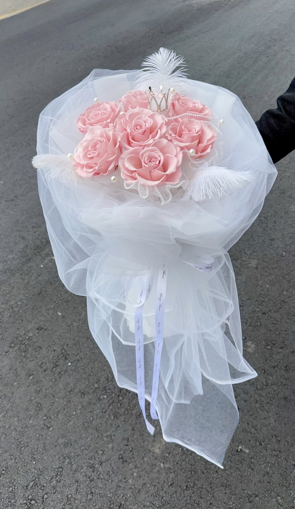 以輕柔的網紗打造層次感十足的外型,搭配頂級厄瓜多玫瑰,呈現超高級的韓系氛圍感。
