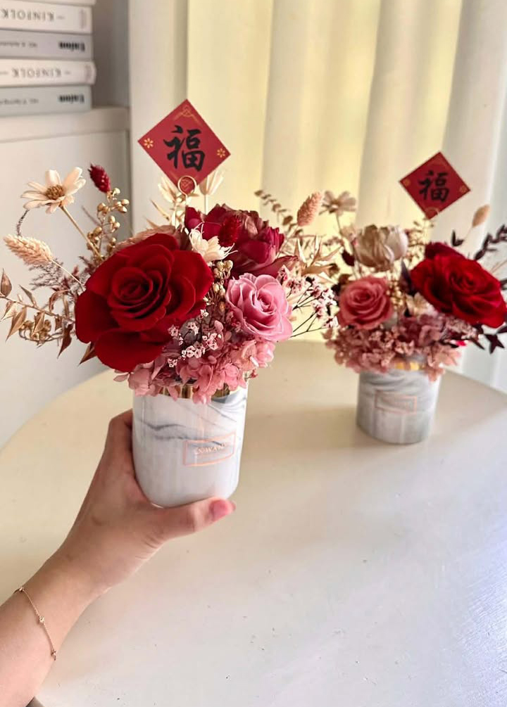 以永生花為主花材,搭配細緻乾燥花、進口葉材與客製色系設計,