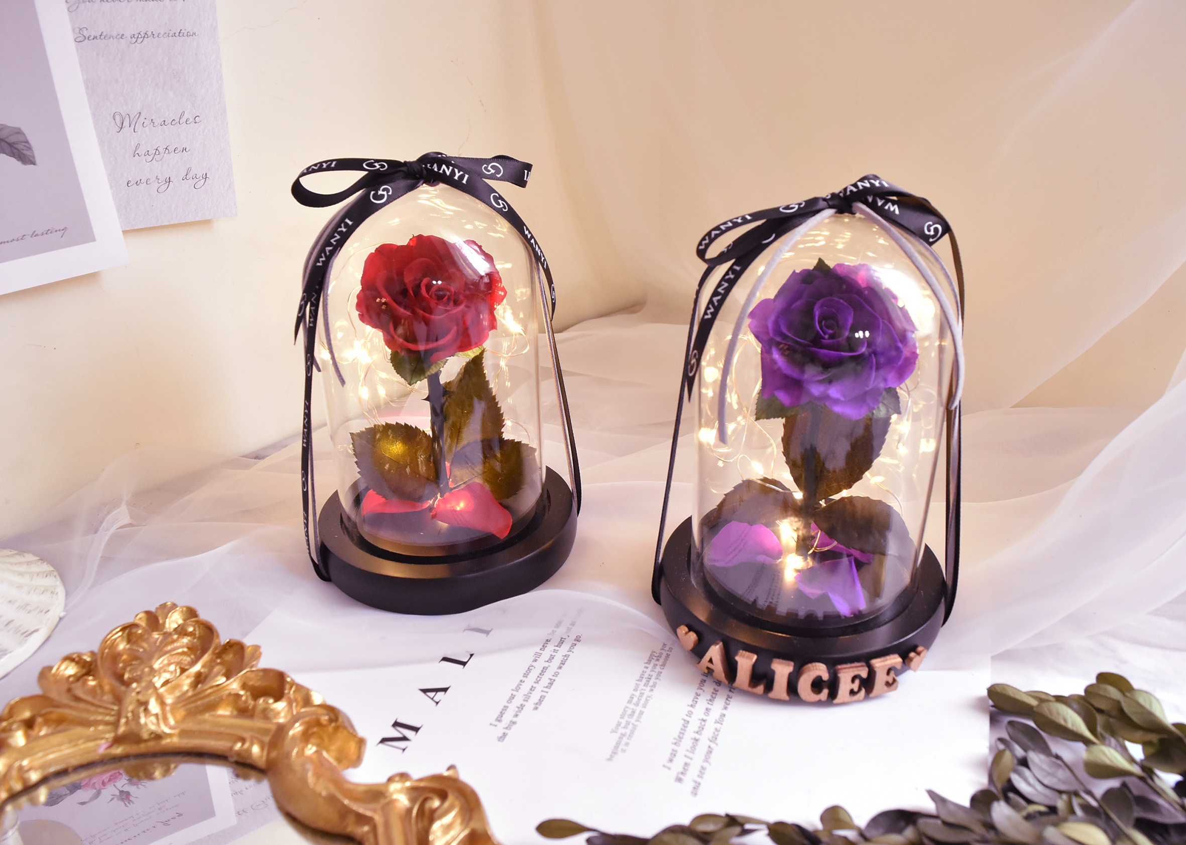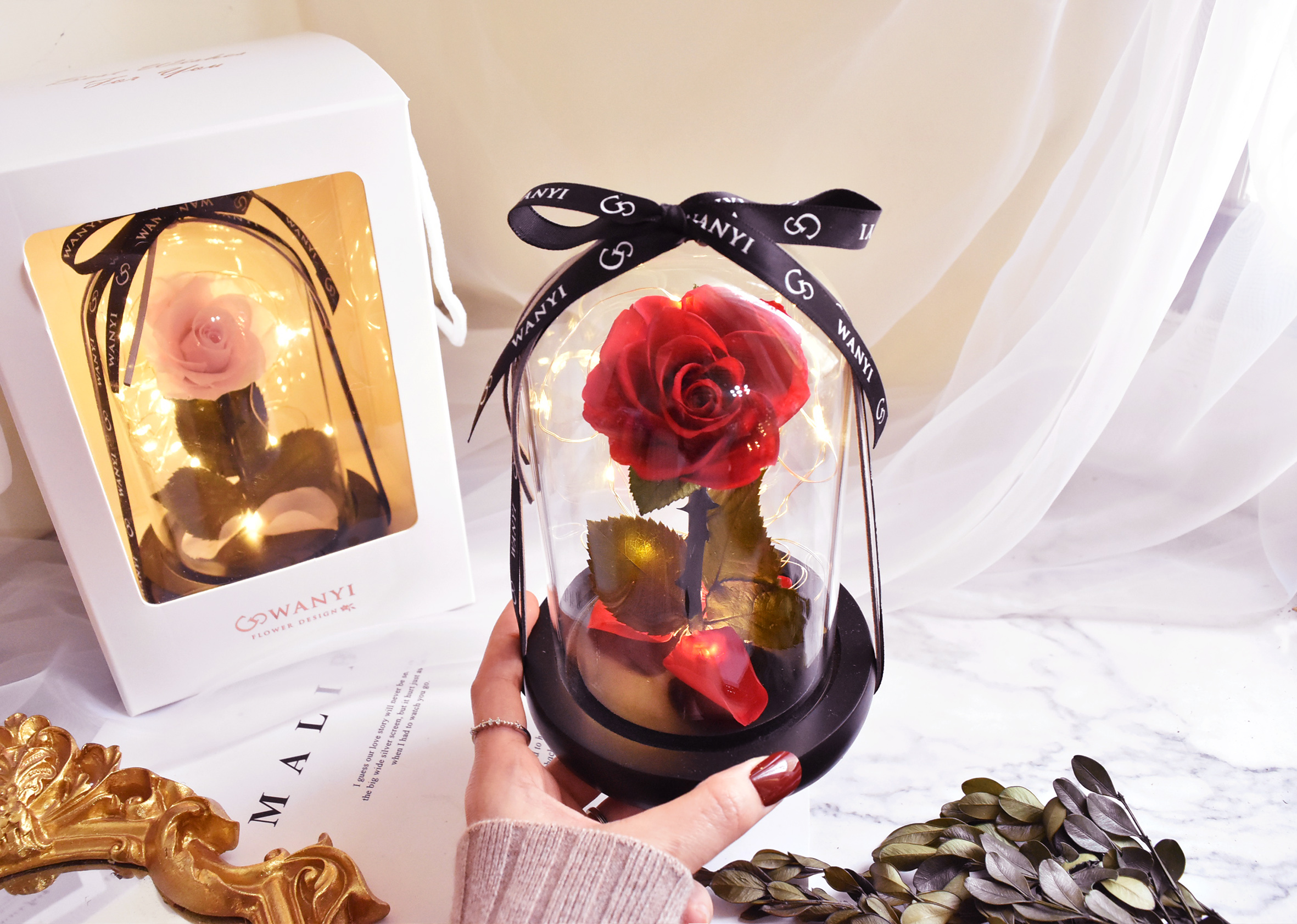 *玫瑰是真花經過特殊處理,所以能長久保持像真花的樣貌。