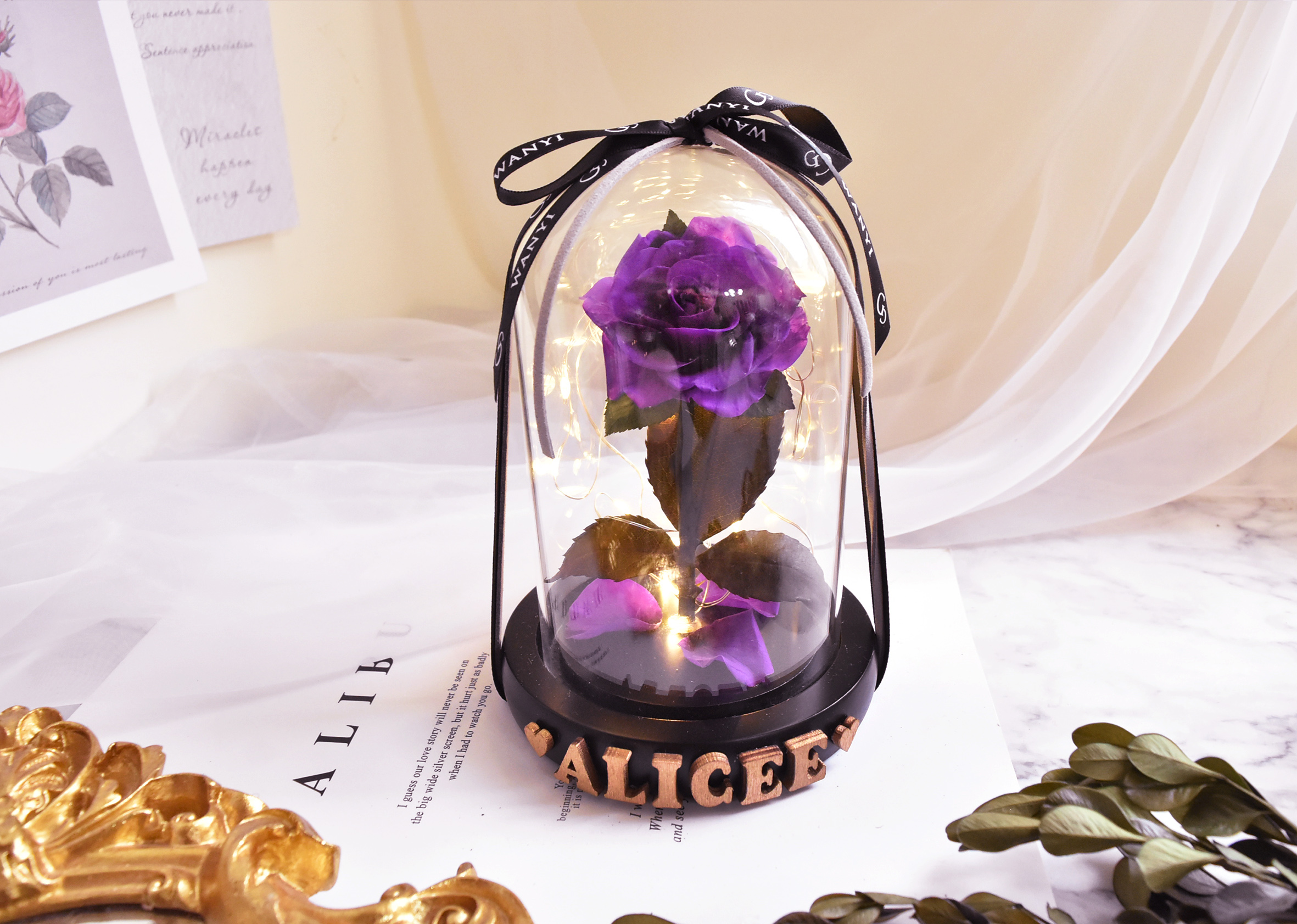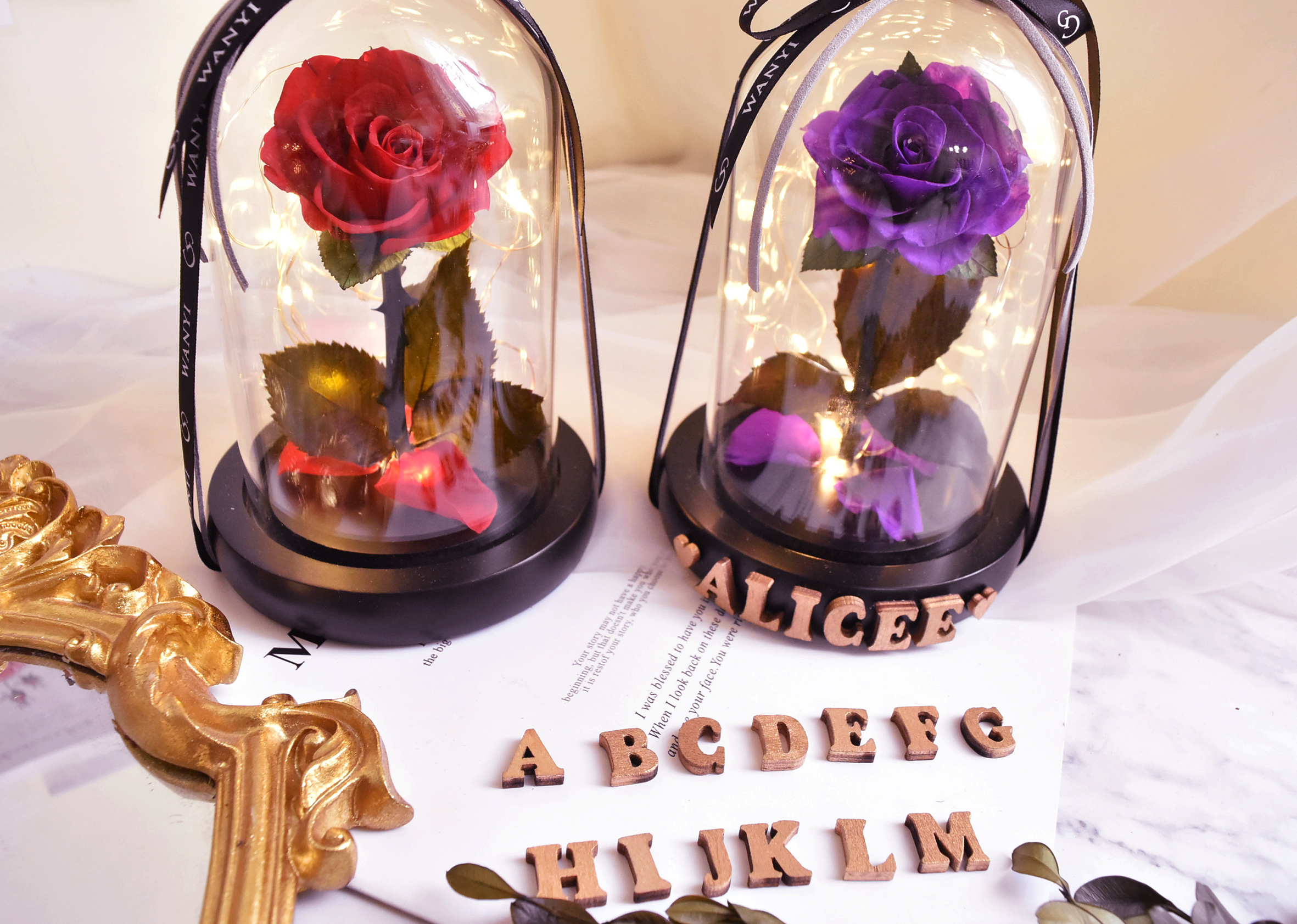特別為您準備客製英文木頭字的部分, 很有質感的金色的木頭字, 可以客製您要的英文字母在玻璃罩底座上,