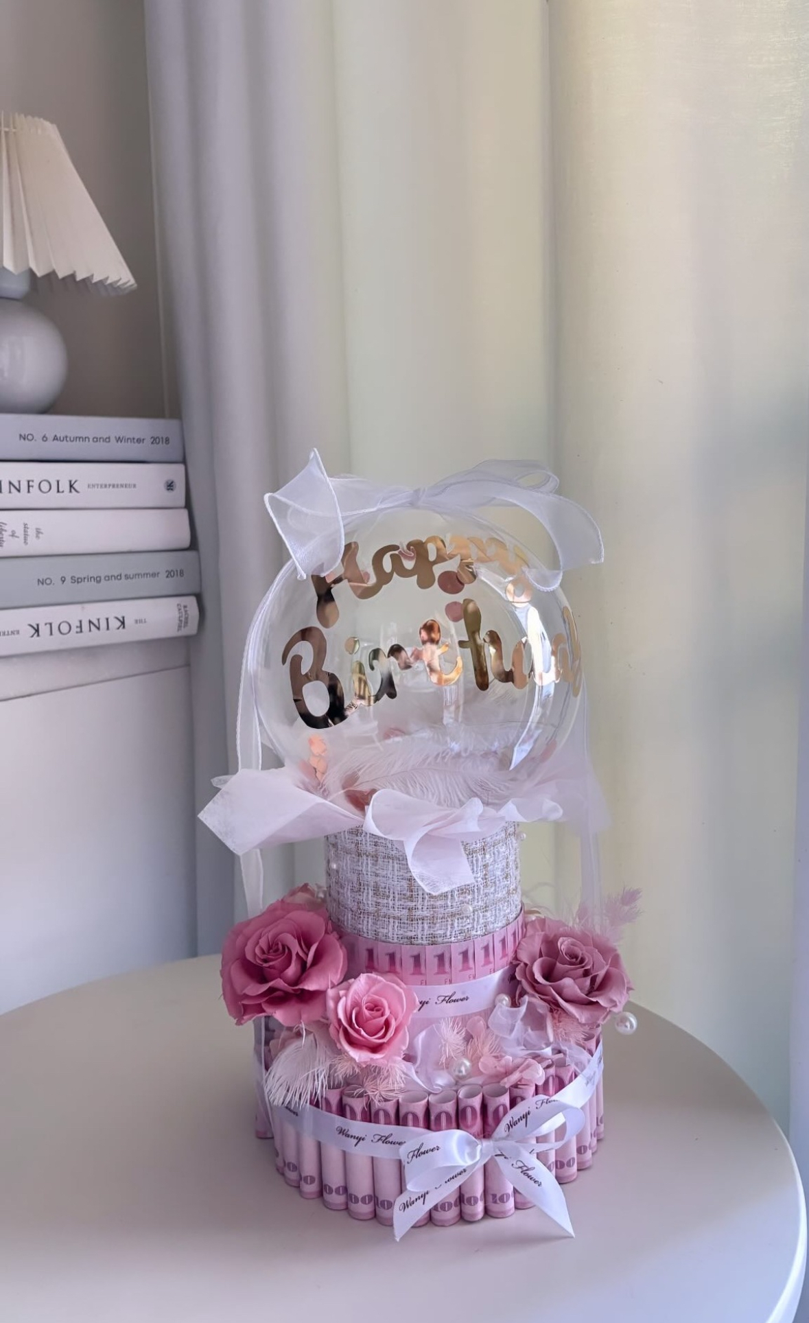 以經典小香風設計為靈感,融合高質感永生花、鈔票造型蛋糕與空飄氣球,