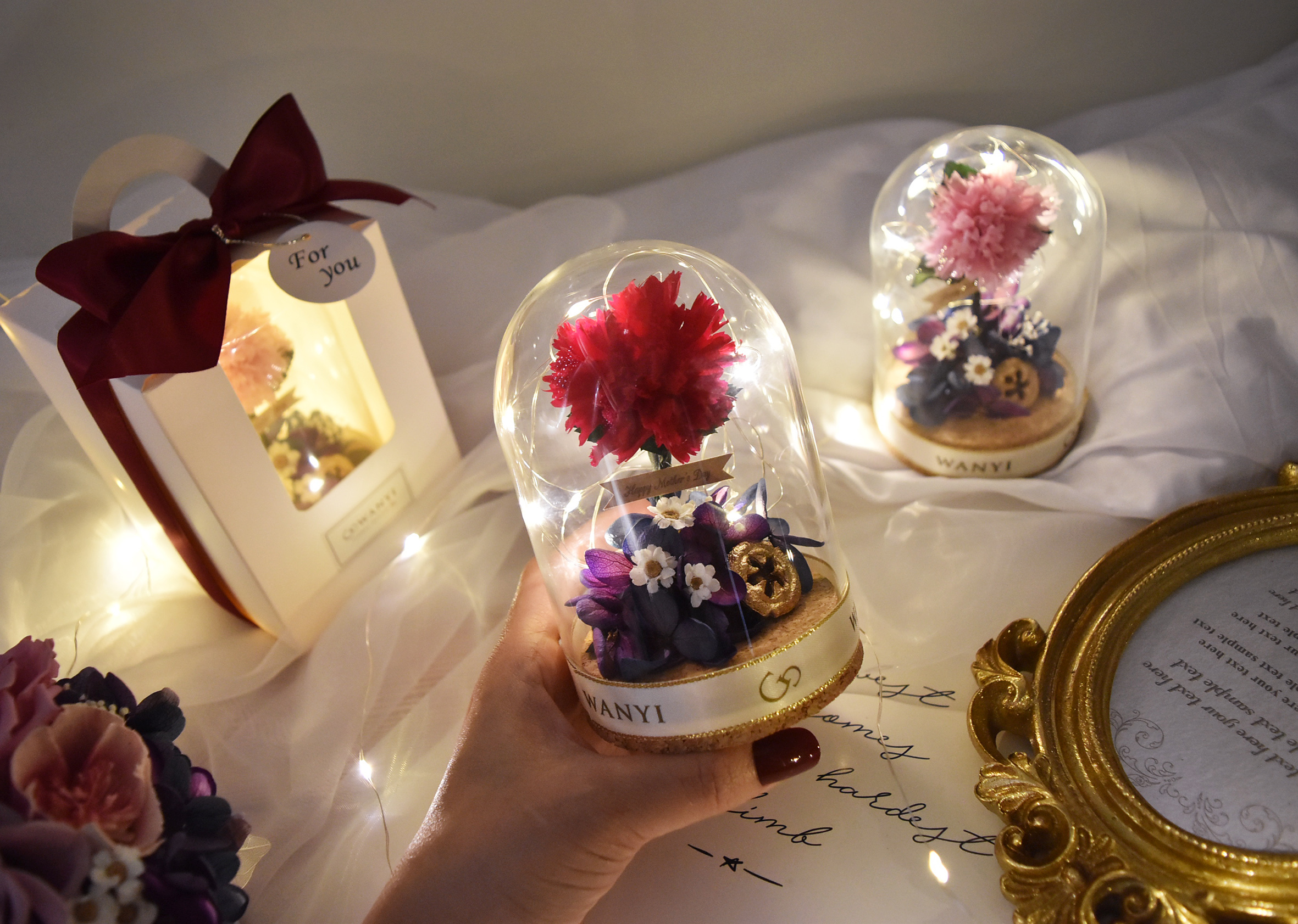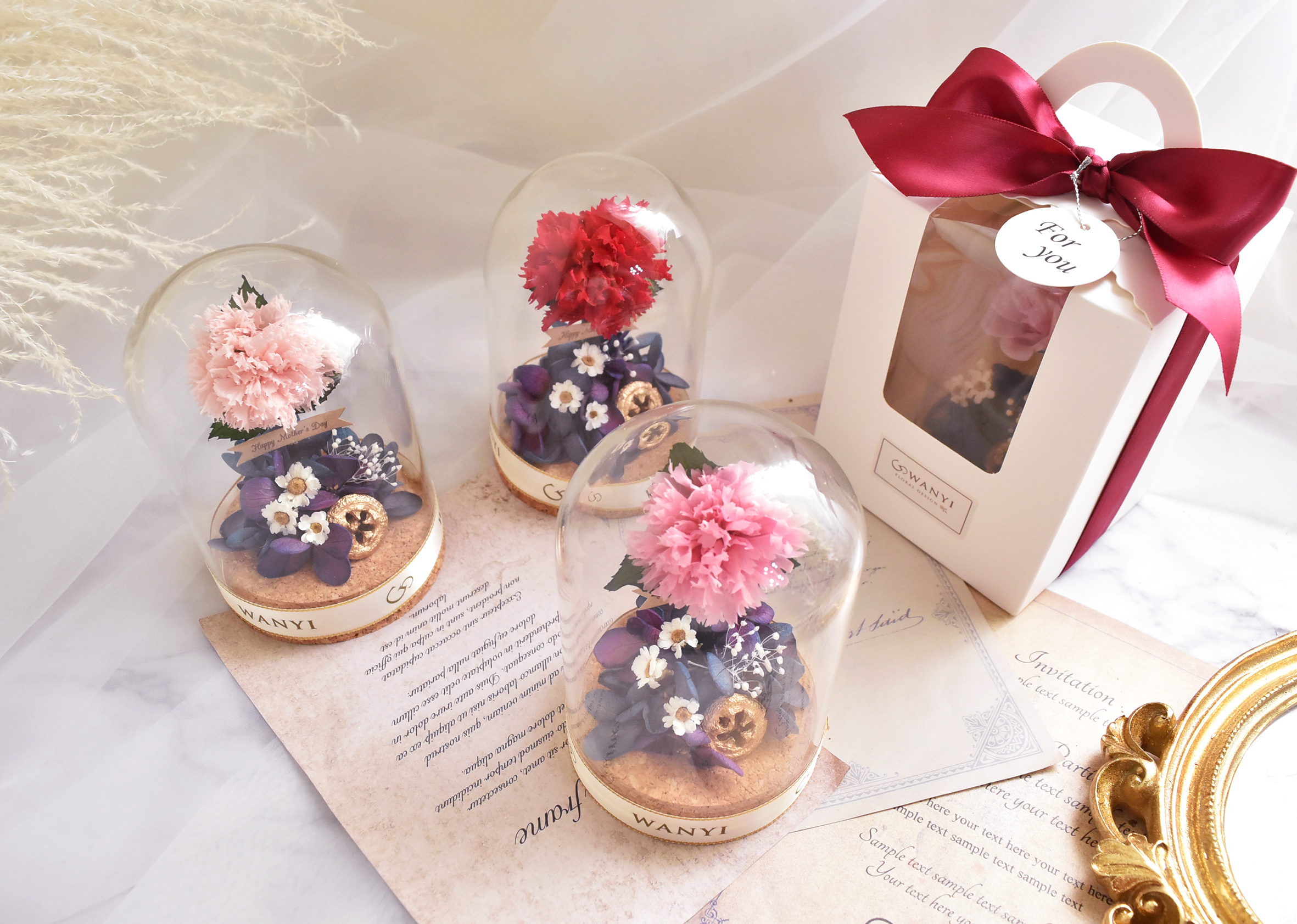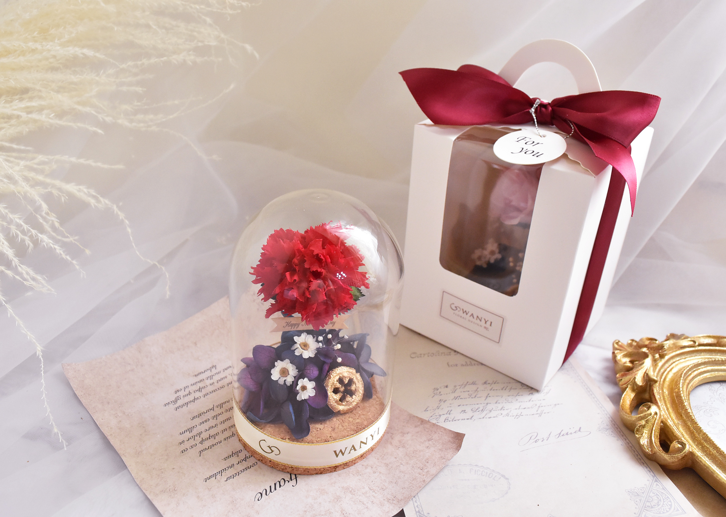 永恆的永生花康乃馨保存在玻璃罩裡,