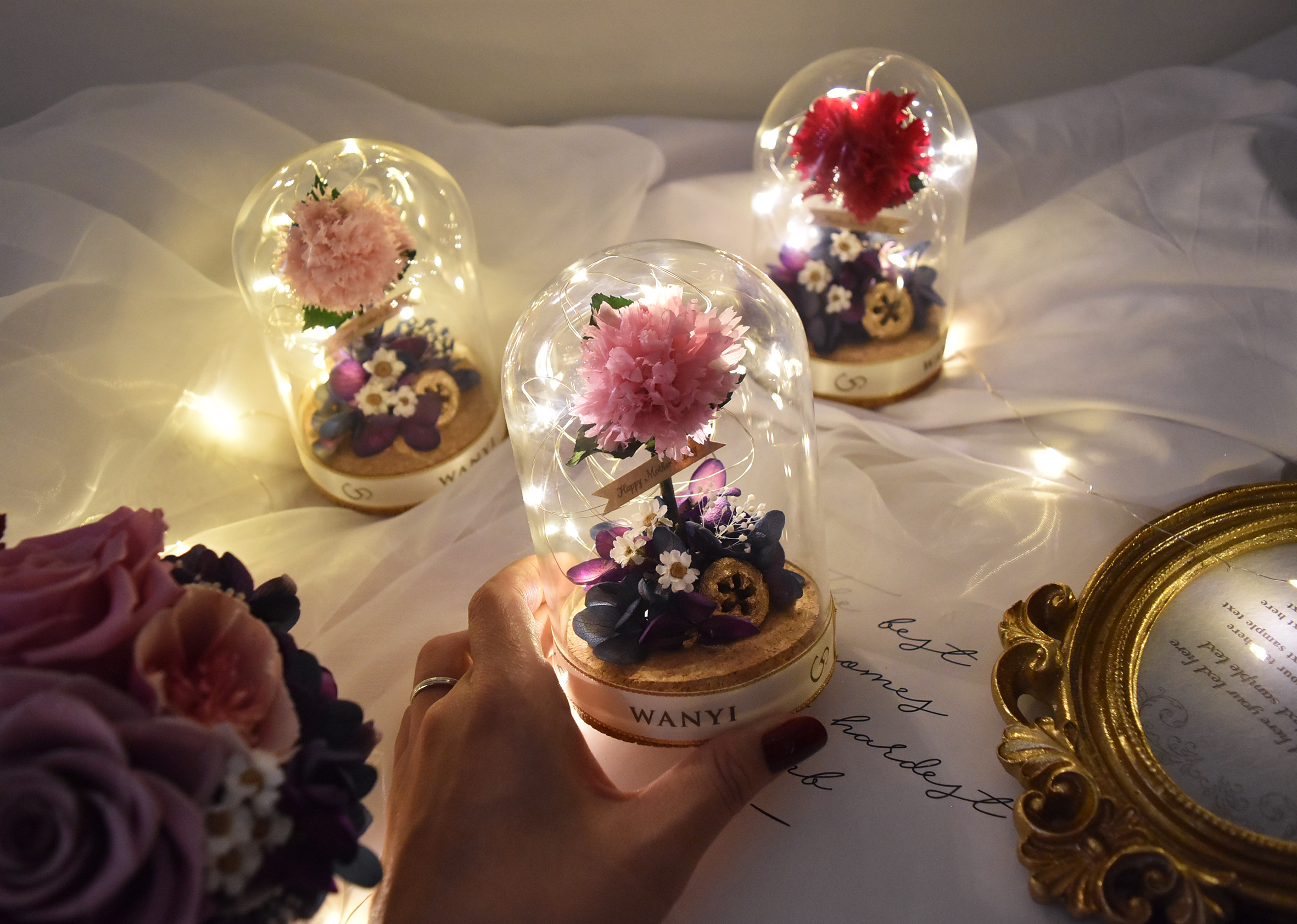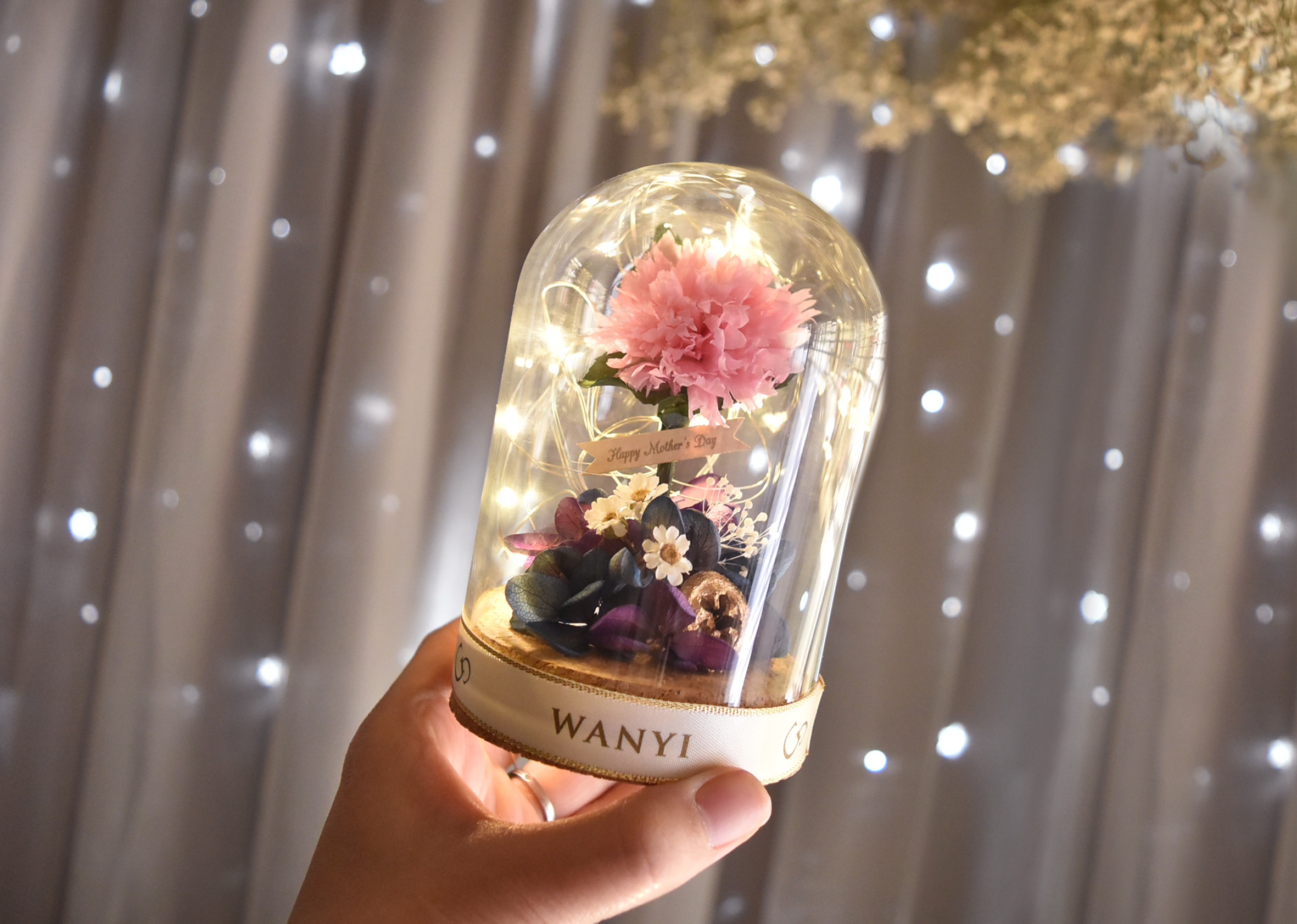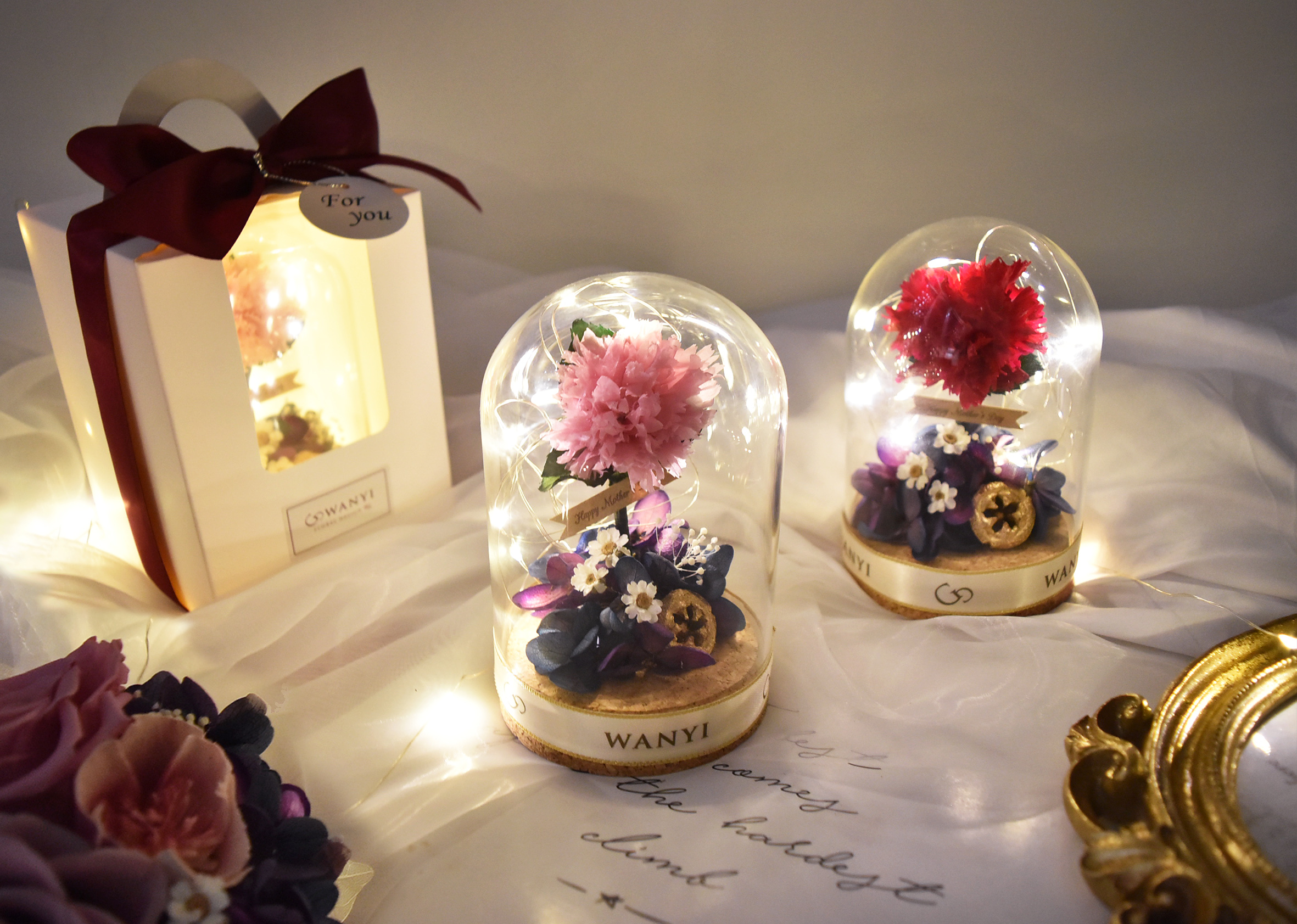 永恆的永生花康乃馨保存在玻璃罩裡,