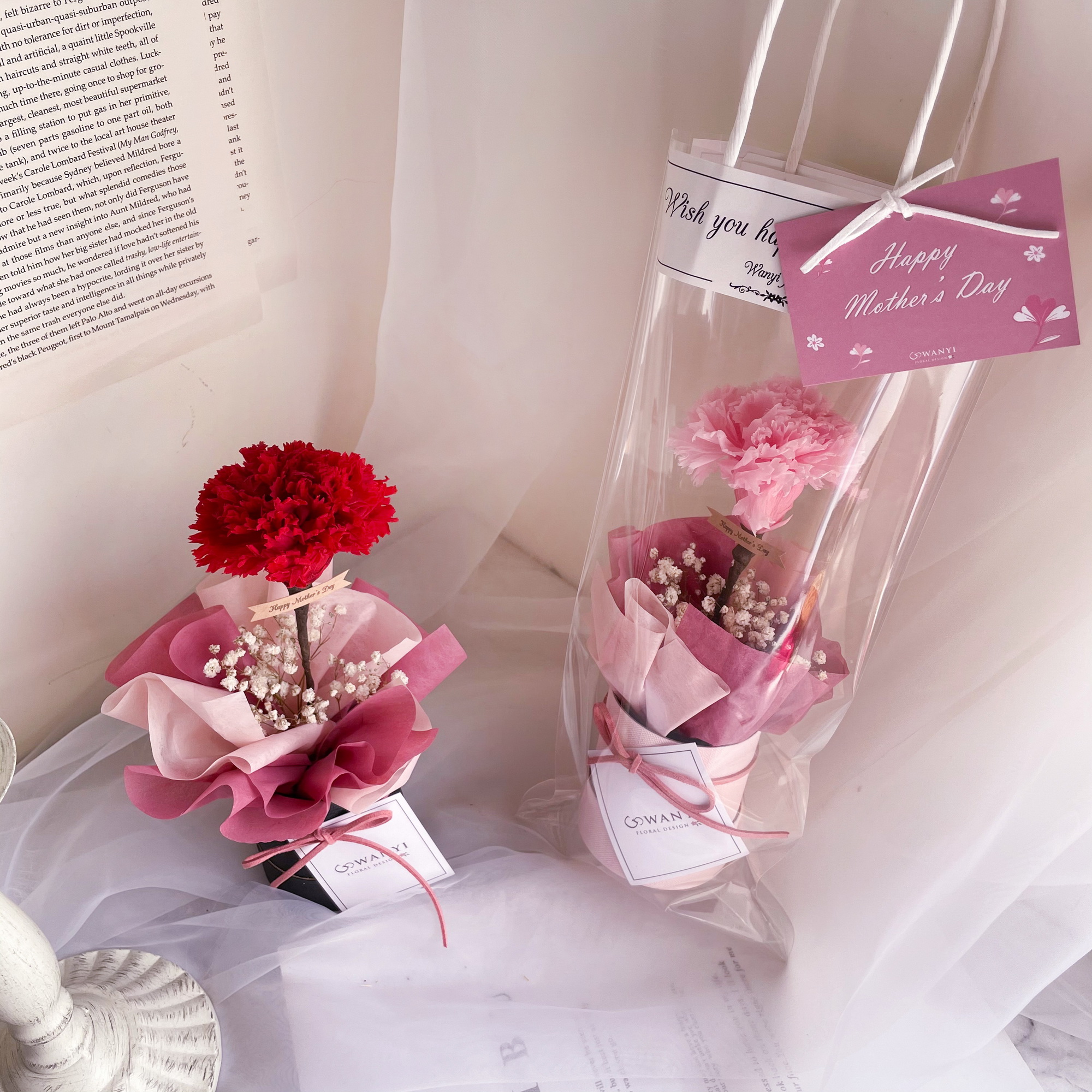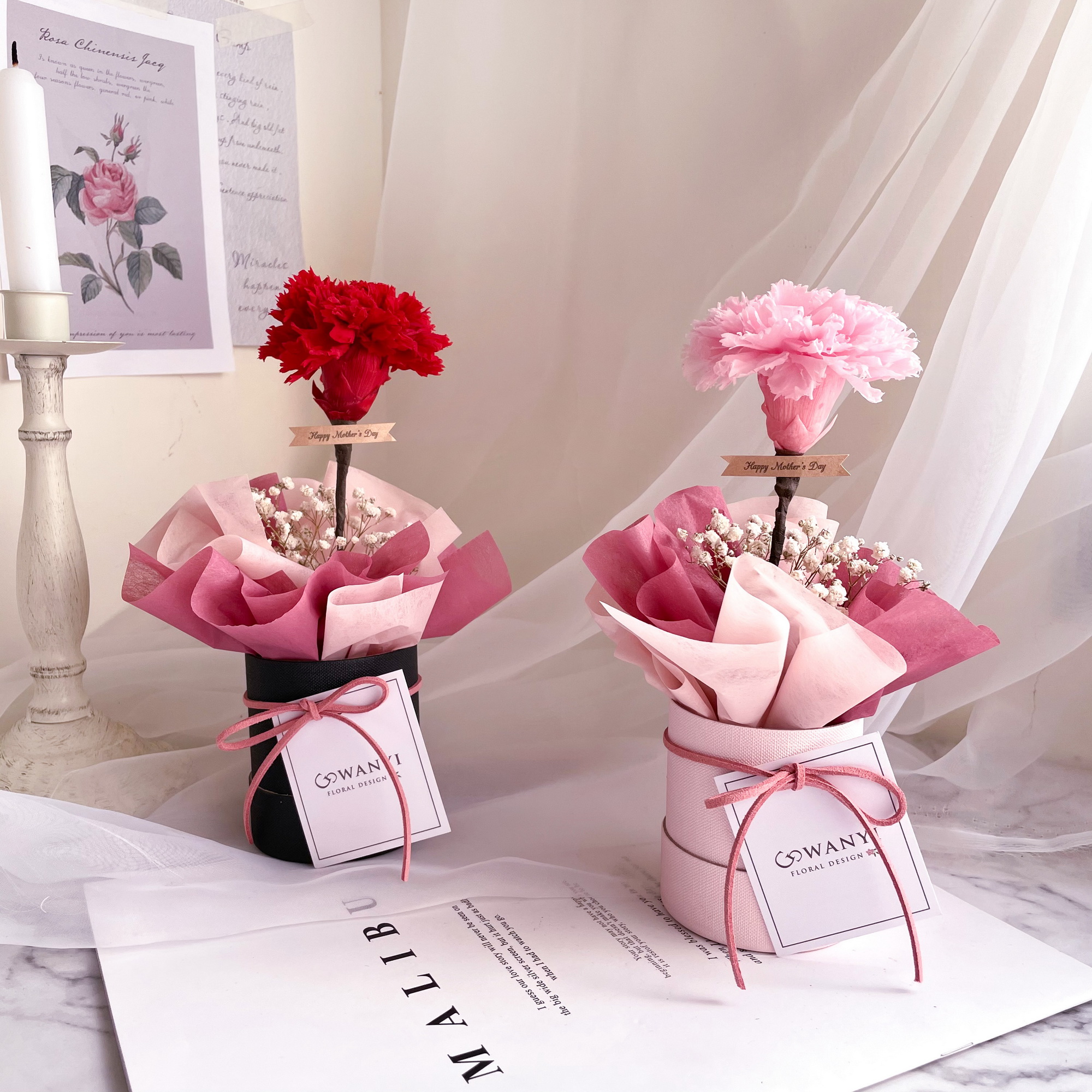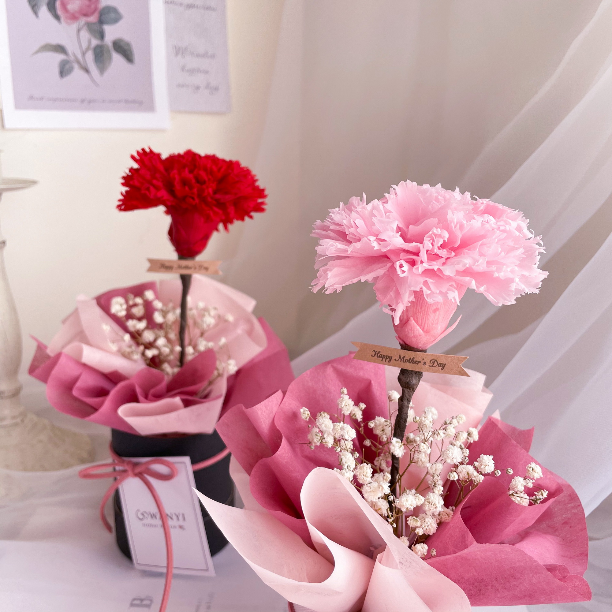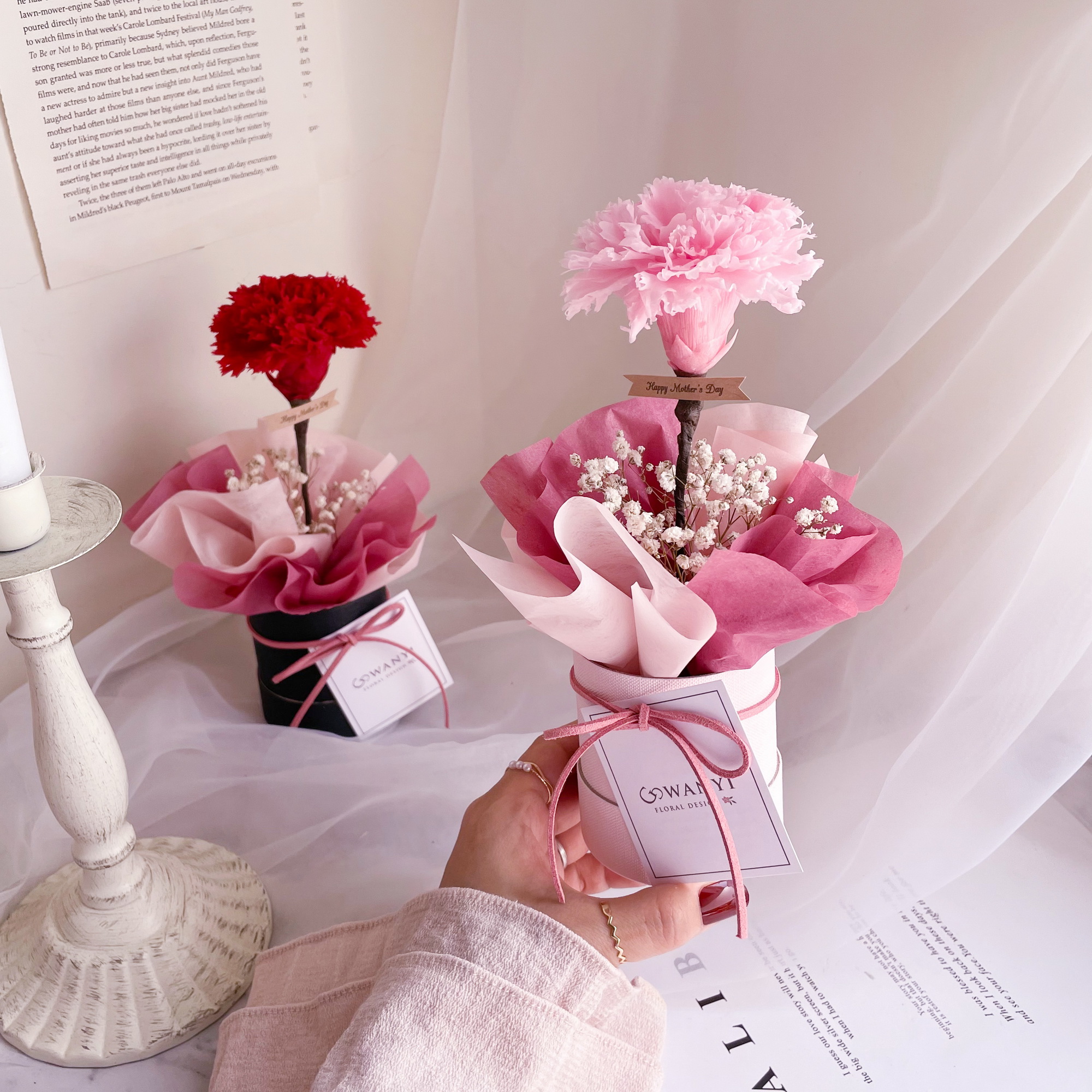 很有質感的韓系康乃馨小樹抱抱桶,使用永生康乃馨,可以放置2-3年不等唷