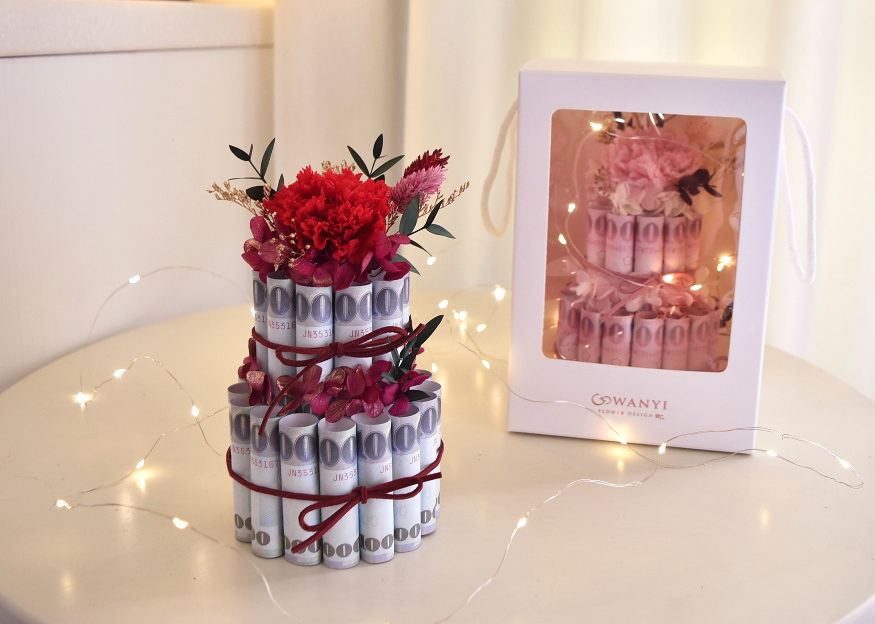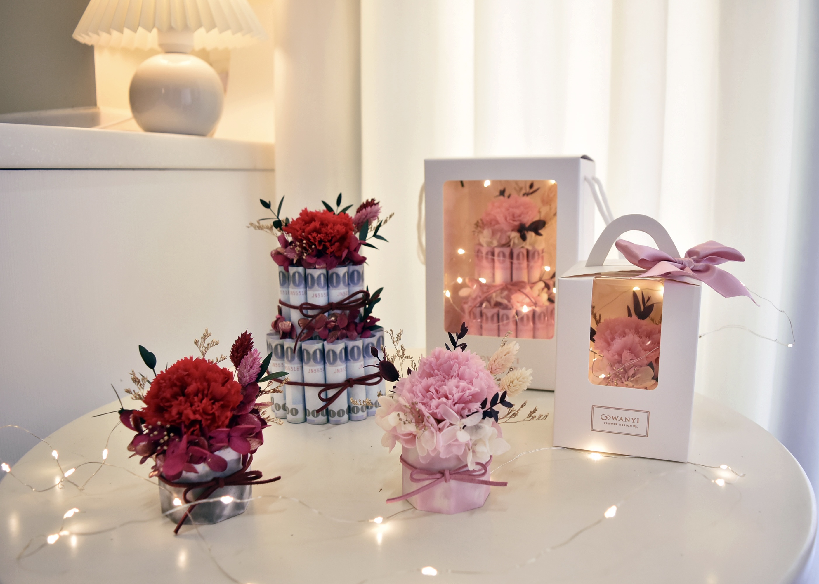 內容:永生花、禮盒包裝、玩具鈔票、母親節小卡、麂皮繩