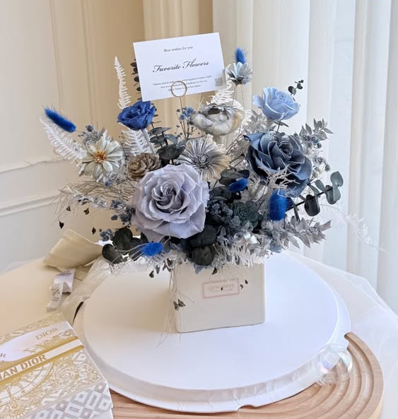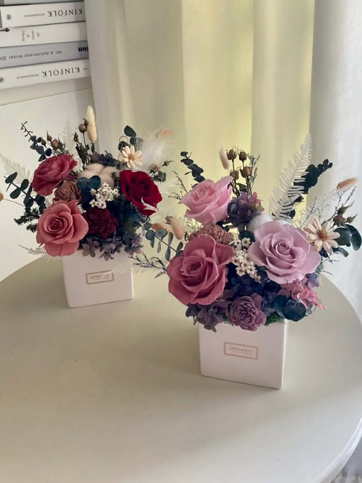 以永生花為主花材,搭配細緻乾燥花、進口葉材與客製色系設計,