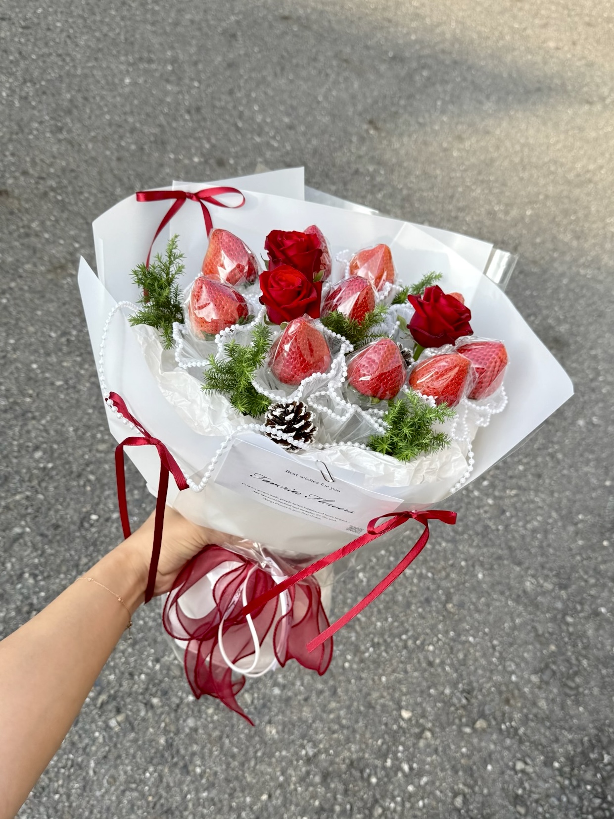 暖冬草莓玫瑰蝴蝶結花束